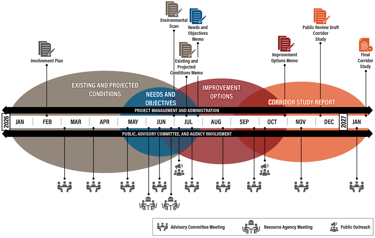 The anticipated schedule follows a 13-month timeframe. A public draft of the I-90 Corridor Study is anticipated by December 2026, and all work is anticipated to be completed by January 2026.